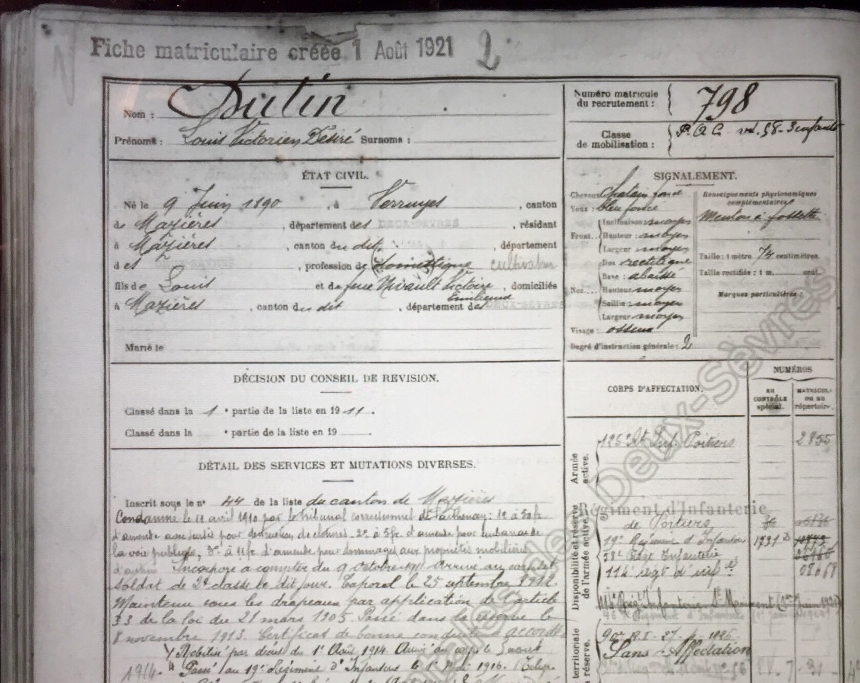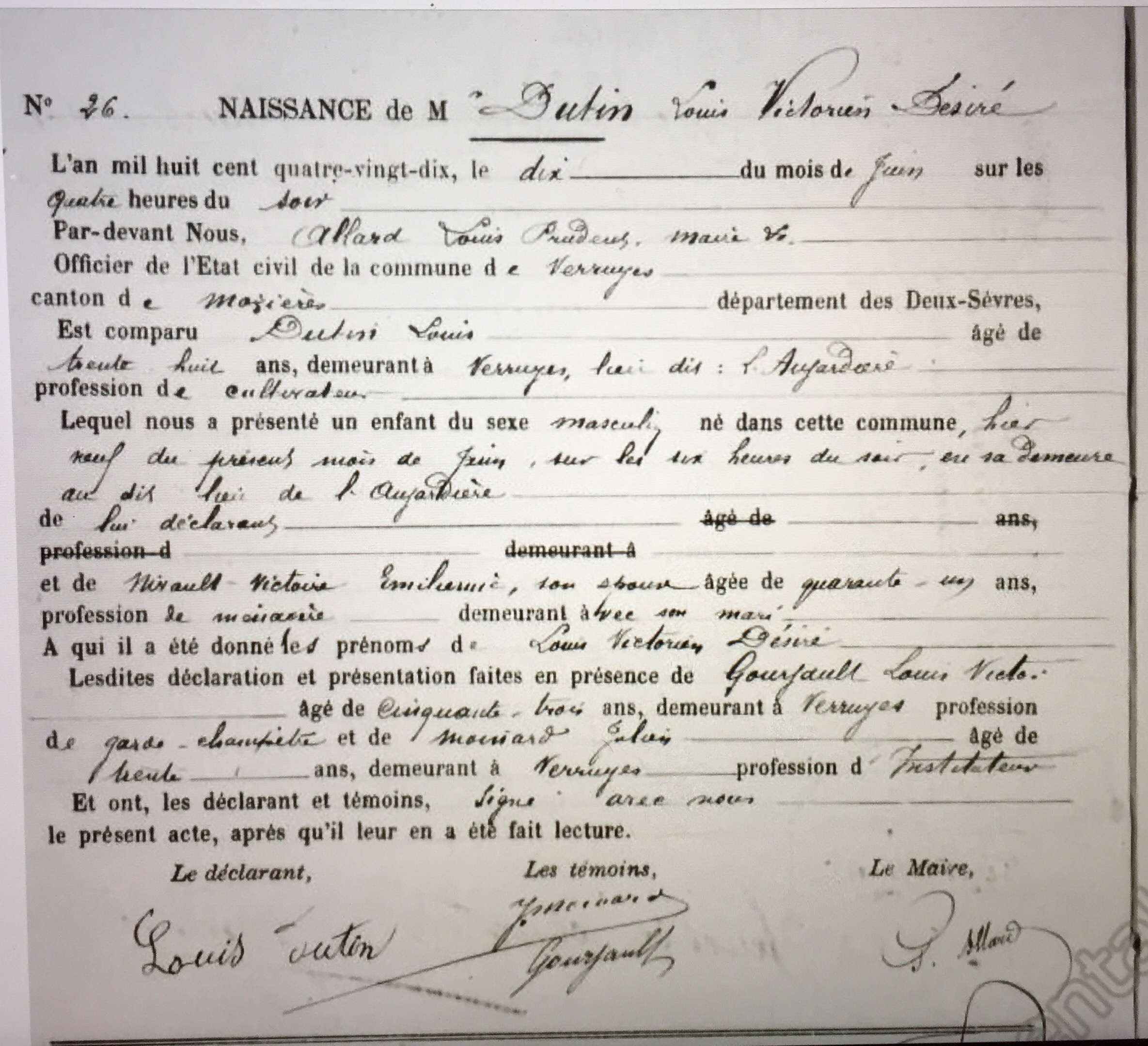 Louis Victorien Dutin est le jeune oncle de Denis, le demi-frère de sa mère, Marie Marcelline Dutin. Il est né à l’Aujardière de Verruyes – notre fief – le 9 Juin 1890, du second mariage de Louis Dutin avec Victoire Émilienne Nivault (oui, oui, je sais 😂).