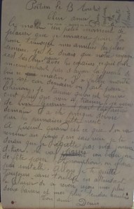 Ce matin un petit moment de plaisir que je consacre pour toi, pour t’envoyer mes amitiés les plus sincères. Je te dirais que notre voyage s’est très bien passé avec les copains ce qui ne m’empêchait pas d’avoir la gueule de bois ce matin. Il a fallu monter son sac car demain on part pour Chinon. Je t’assure qu’on est équipé, c’est plus que rien à traîner. Je viens de voir Guérin, il part lui aussi demain. Il a été presque dévoré par les punaises cette nuit. À présent, quand est ce que l’on va revenir au pays, j’en sais rien. Je te dirais que je ne regrette pas ma journée d’hier. On va passer un beau jour de fête pour l’Assomption, on sera pas installé. Allons je te quitte toujours sans t’oublier. En attendant le plaisir de se revoir, reçois mes plus doux baisers et mes plus tendres amitiés.