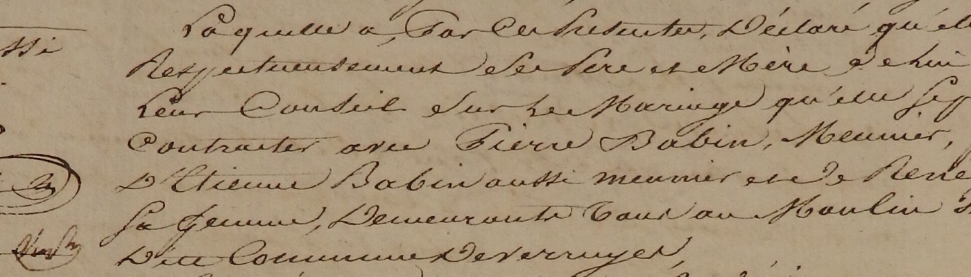 L’acte rappelle qu’elle a 25 ans révolus, l’âge de la liberté matrimoniale à l’époque à condition de respecter justement une procédure envers ses parents réfractaires et « qu’elle supplie respectueusement ses père et mère de lui donner leur conseil sur le mariage qu’elle projette avec Pierre Babin, meunier… »