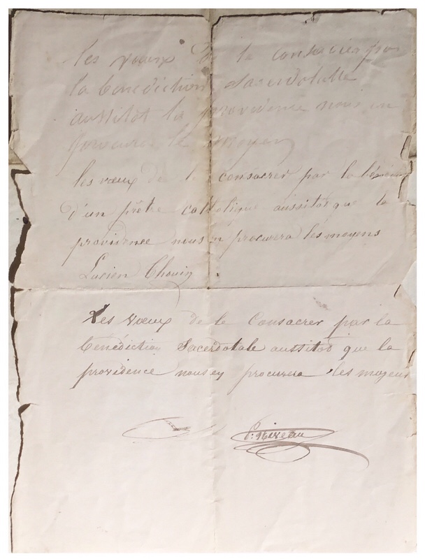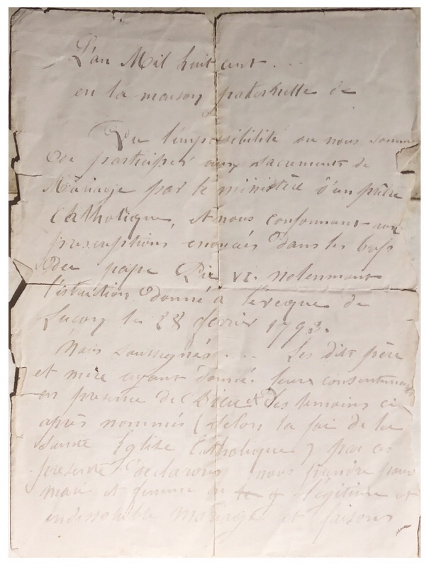 Le fils de Pierre, prénommé comme son père, nous a légué un morceau de papier sur lequel est inscrit ce qui s’apparente à la formule dissidente de mariage, et il y a écrit de sa main la promesse de régulariser à l’église ce sacrement dès que la Providence leur en donnera les moyens.