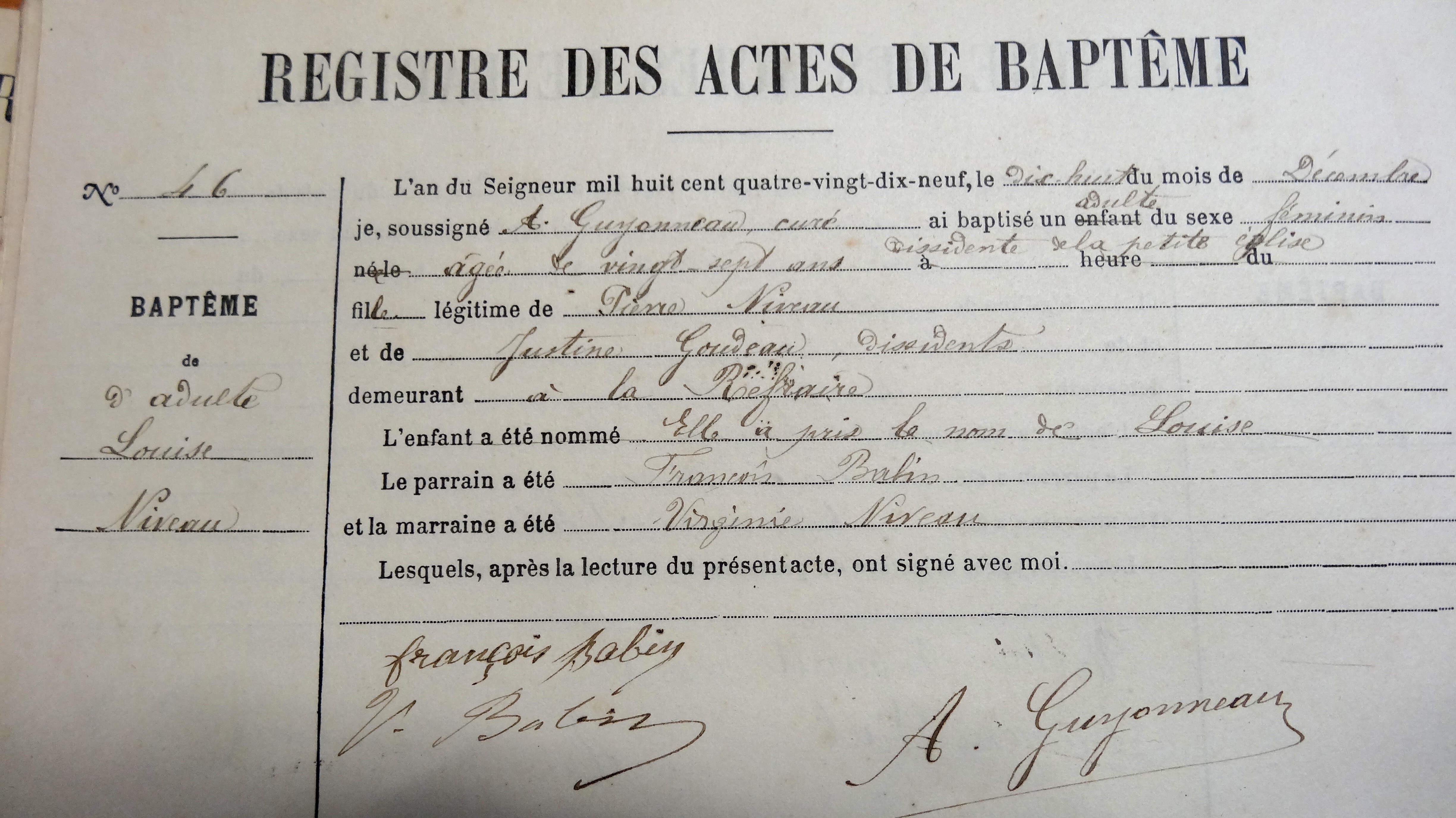 Les deux sœurs, Marie Germaine et Marie Louise, sont là, avec leurs enfants, leurs conjoints et les familles de leurs conjoints. Leur frère n’est pas encore marié mais le sera l’année suivante. Leur sœur Mélanie restera célibataire. Leurs parents, Pierre Niveau et Justine Goudeau doivent être là aussi, et ont certainement approuvé la décision de leurs enfants. Peut-être ont-ils aussi pris la même d’ailleurs ? Est-ce que Louis Nivault, le cousin germain de leur père Pierre est présent avec son fils Auguste ?