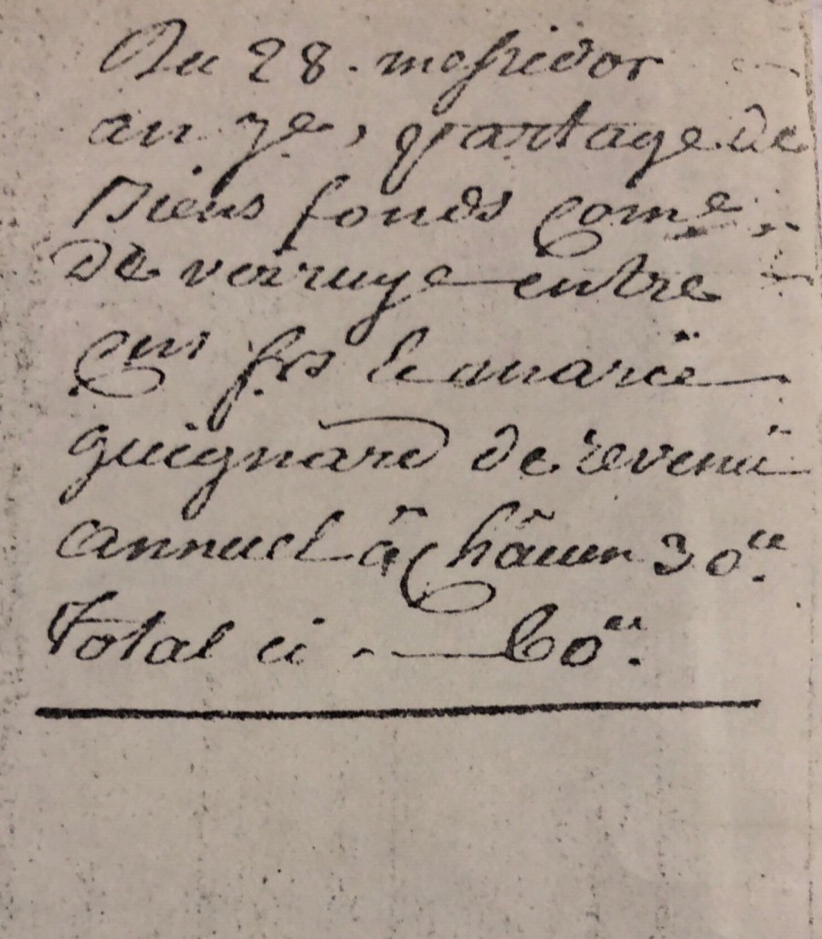 Convenu encore de clause expresse entre les dittes parties que les acquits que le dit Guignard a fait seul lui appartiendront en entier attendu que c’est par ses travaux, [?] industries, et qu’il a même fait des emprunts plus que moitié pour ces mêmes acquits ainsi que la dite Guignard le reconnaît et reconnaît au moyen de quoi renonce à toutes prétentions a cet égard, bien entendu que Guignard s’oblige à tenir quitte sa soeur de toutes dettes […]