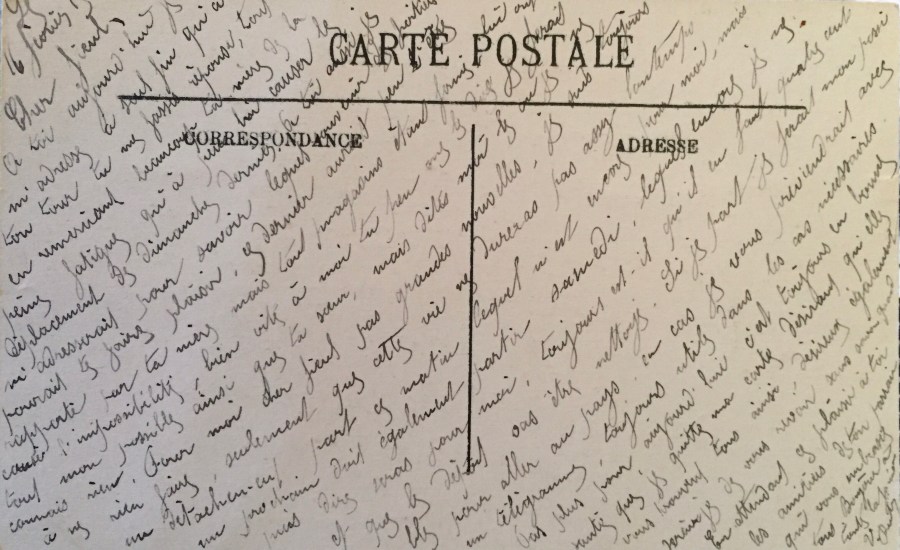 […] Sa dernière carte postale à Denis, son filleul, datée du 16 février, racontait la visite de sa soeur, Marcelline, la mère de Denis. Victorien culpabilisait de lui avoir fait faire ce voyage fatiguant pour elle. A peine envoyée, cette carte est suivie de celle-ci, datée deux jours après, le 18 février 1915. La veille, le 17, il a en reçu une de Denis lui proposant, à son tour, de venir à Poitiers. Il n’attend pas pour lui répondre. Oui, oui, oui que Denis vienne. Il ira à la gare, le chercher au train, qu’il soit là ou pas. […]